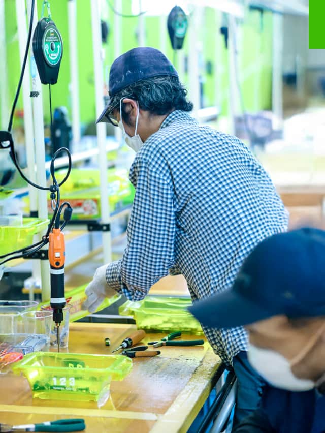 人の手による分解・選別で高い再資源化率を実現。リサイクル・リユースを通じて、環境保全と資源の有効活用と障がい者の就労機会の創出を両立しています。